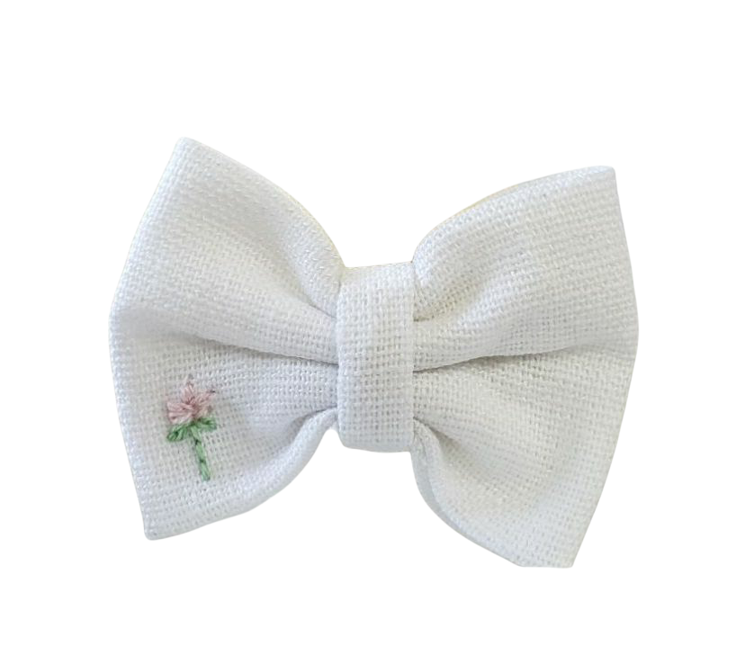 Laço feito de tecido linho na cor branca, bordado com desenho de botão de flor com várias opções de cores, feito inteiramente à mão na presilha bico de pato tamanho P. Confeccionado com os melhores materiais, costurado e sem uso de cola quente para um acabamento mais delicado.